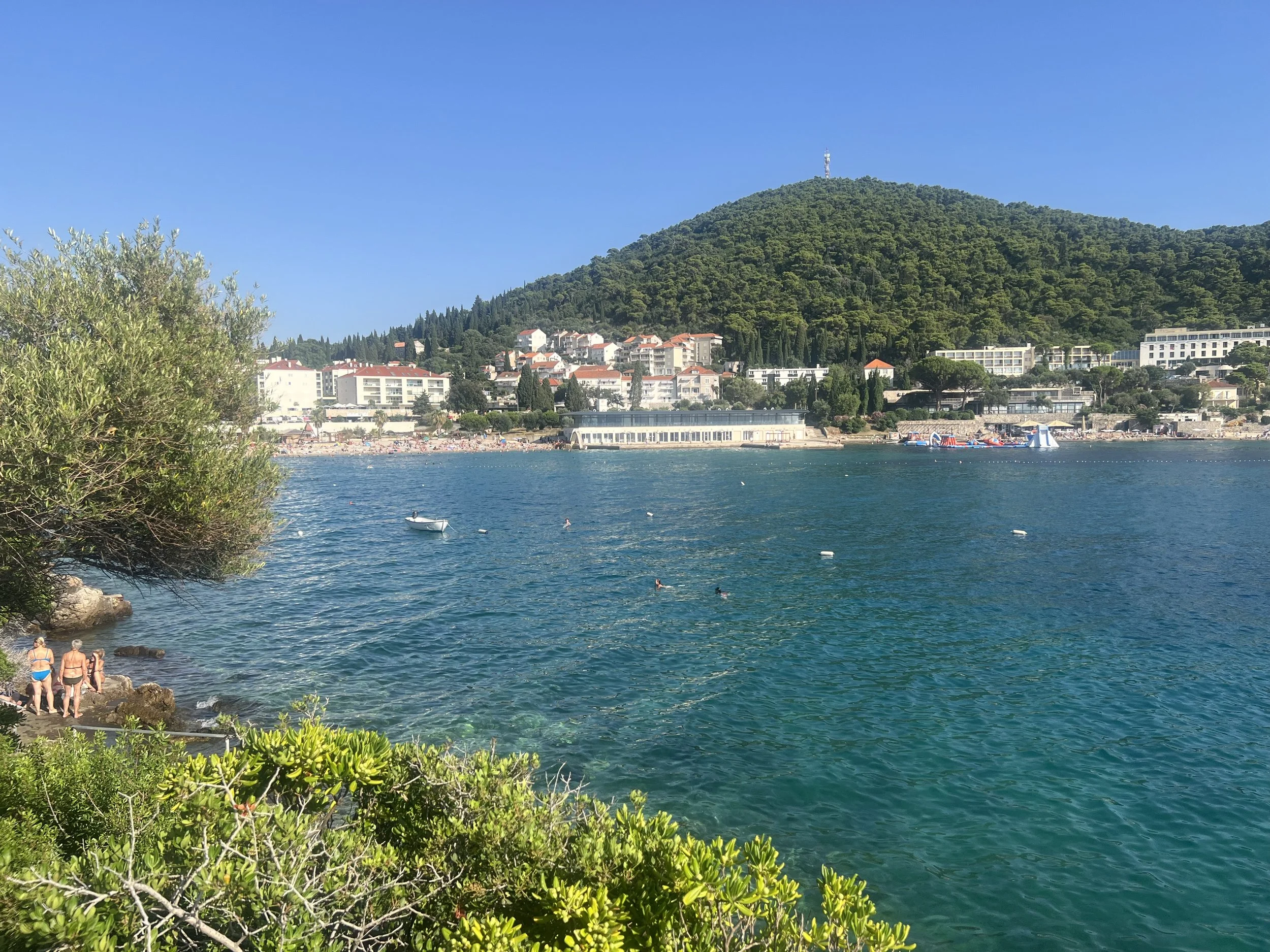 Uvala Lapad beach. This ones a bit further away, on the Lapad peninsula, which has lots of mid market hotels and a holiday resort vibe, with a central strip with lots of restaurants and bars. The beach is also the most like one of those Spanish beaches, much bigger than all the other ones we went to, with some inflatable climbing things in the middle. The walk into the water is quite shallow and the water near the edge was very warm. The hotel that looks after this one had gone bankrupt, so the toilets/showers were closed and there were lots of closed concessions. So this was my least favourite.